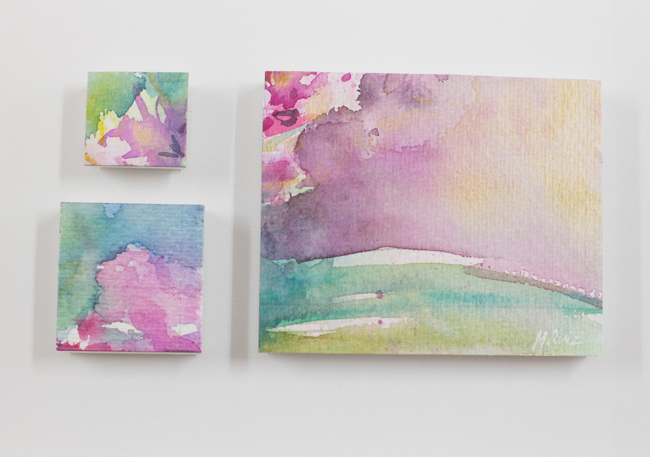 Esta acuarela es alegórica con colores fríos. Las medidas son de 20×22 cms.